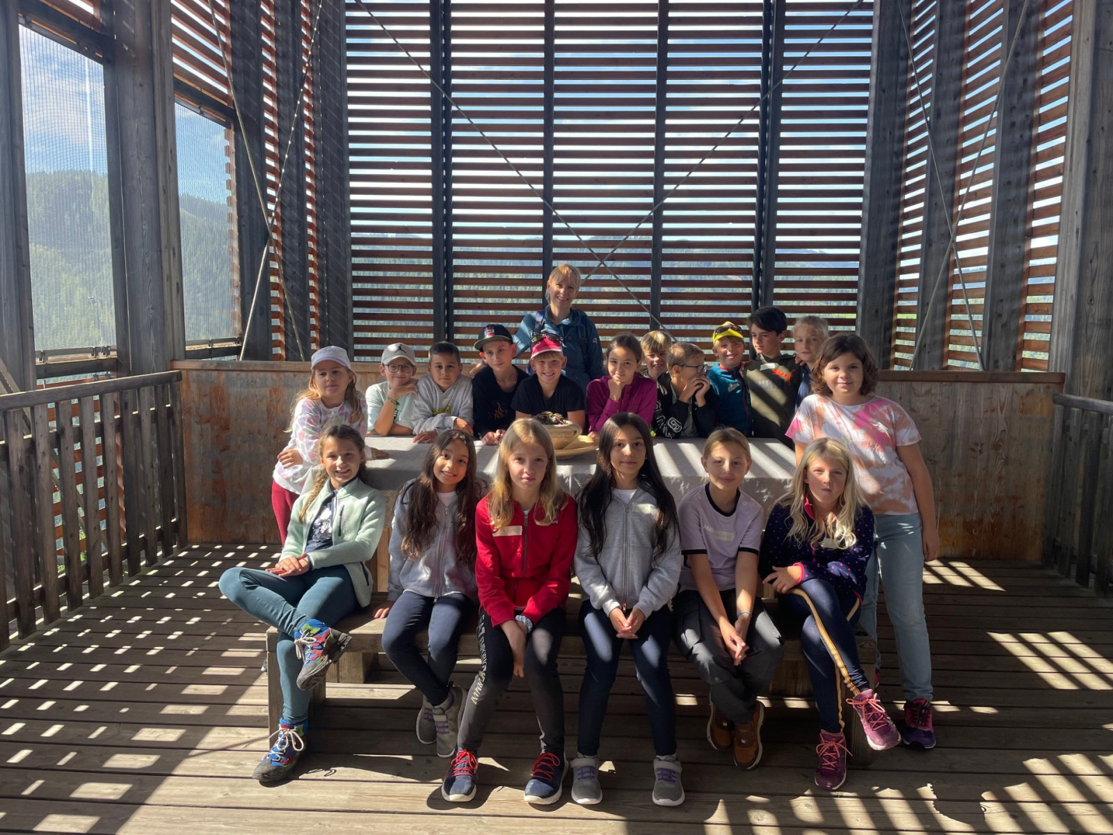 Bei Kaiserwetter am nächsten Tag wanderten wir – unterbrochen durch viele Spiele, Teamaufgaben und „Waldchallenges“ (Bauen eines Dorfes bzw. einer Kugelbahn mit Waldmaterial, Verstecken, Wald mit allen Sinnen erleben, etc.) zum Pilgerkreuz auf ca. 700m Höhe. Den Tagesausklang verbrachten wir im hoteleigenen Hallenbad.