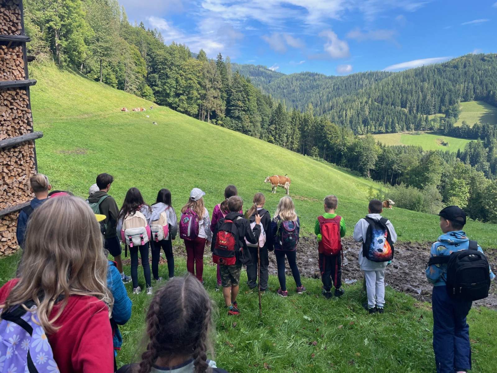 Bei Kaiserwetter am nächsten Tag wanderten wir – unterbrochen durch viele Spiele, Teamaufgaben und „Waldchallenges“ (Bauen eines Dorfes bzw. einer Kugelbahn mit Waldmaterial, Verstecken, Wald mit allen Sinnen erleben, etc.) zum Pilgerkreuz auf ca. 700m Höhe. Den Tagesausklang verbrachten wir im hoteleigenen Hallenbad.