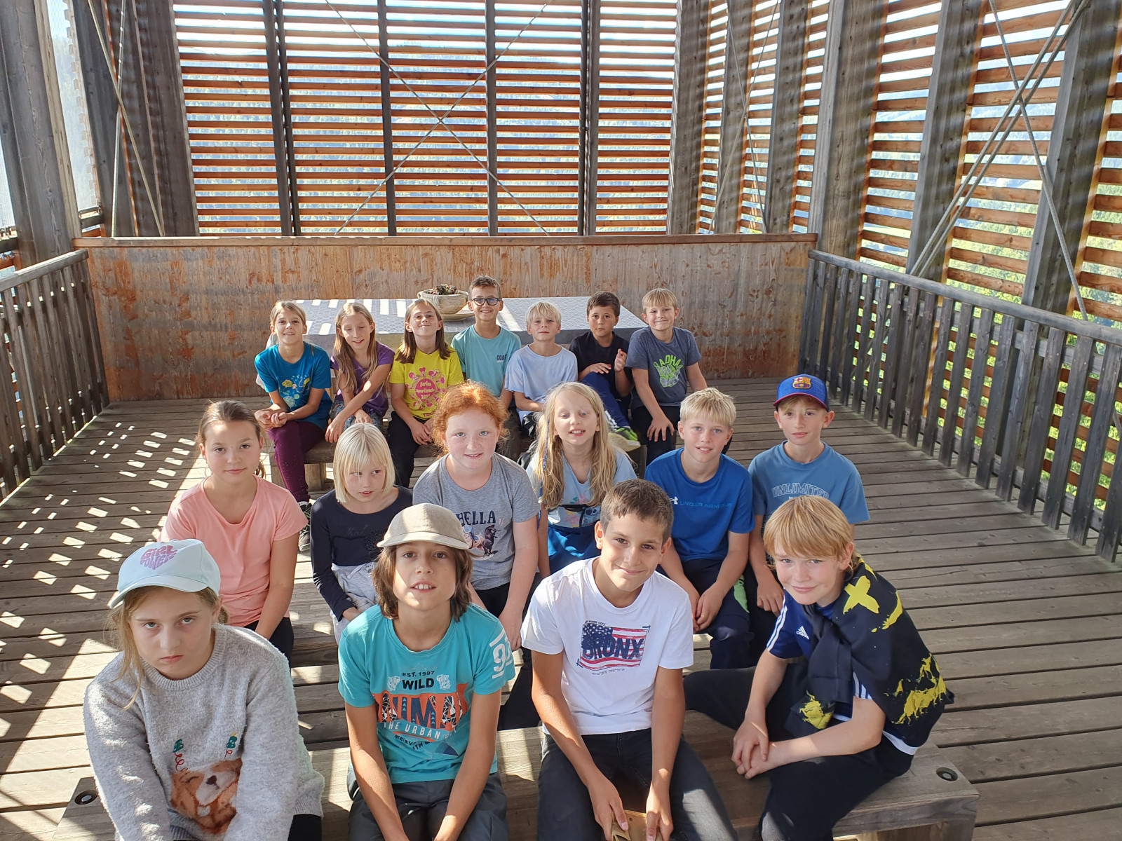 Bei Kaiserwetter am nächsten Tag wanderten wir – unterbrochen durch viele Spiele, Teamaufgaben und „Waldchallenges“ (Bauen eines Dorfes bzw. einer Kugelbahn mit Waldmaterial, Verstecken, Wald mit allen Sinnen erleben, etc.) zum Pilgerkreuz auf ca. 700m Höhe. Den Tagesausklang verbrachten wir im hoteleigenen Hallenbad.