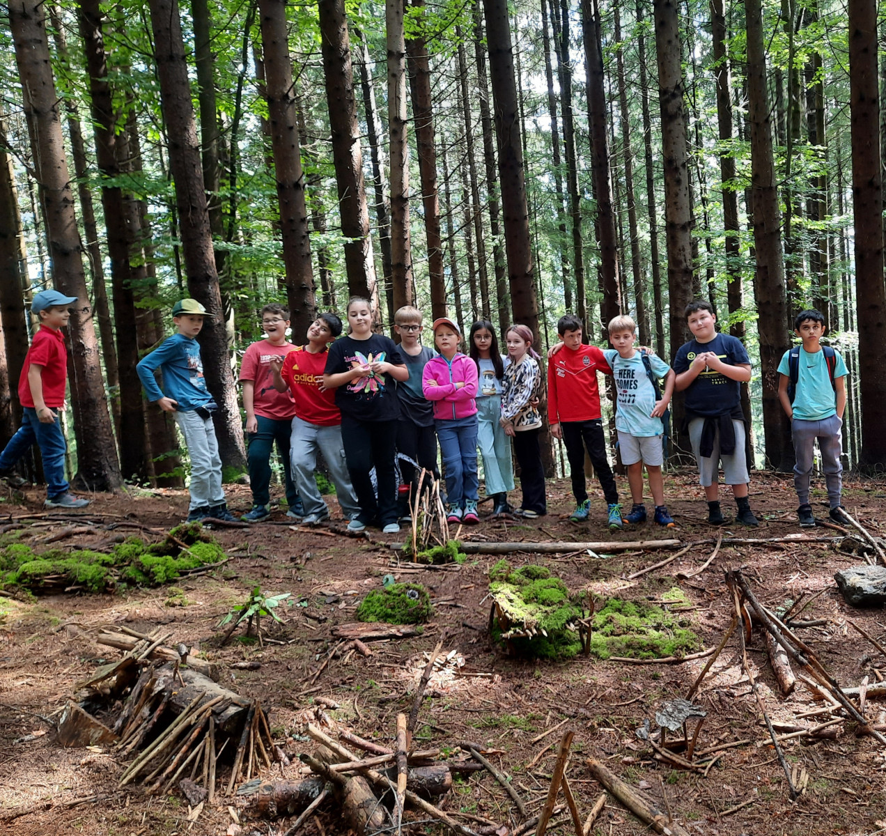 Bei Kaiserwetter am nächsten Tag wanderten wir – unterbrochen durch viele Spiele, Teamaufgaben und „Waldchallenges“ (Bauen eines Dorfes bzw. einer Kugelbahn mit Waldmaterial, Verstecken, Wald mit allen Sinnen erleben, etc.) zum Pilgerkreuz auf ca. 700m Höhe. Den Tagesausklang verbrachten wir im hoteleigenen Hallenbad.