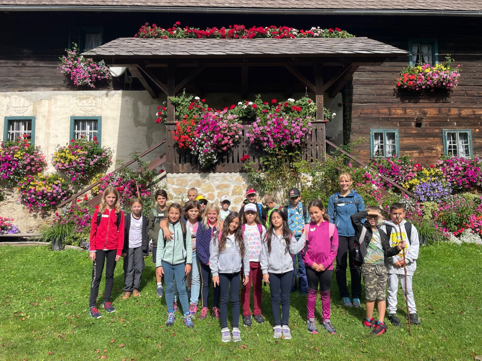 Bei Kaiserwetter am nächsten Tag wanderten wir – unterbrochen durch viele Spiele, Teamaufgaben und „Waldchallenges“ (Bauen eines Dorfes bzw. einer Kugelbahn mit Waldmaterial, Verstecken, Wald mit allen Sinnen erleben, etc.) zum Pilgerkreuz auf ca. 700m Höhe. Den Tagesausklang verbrachten wir im hoteleigenen Hallenbad.